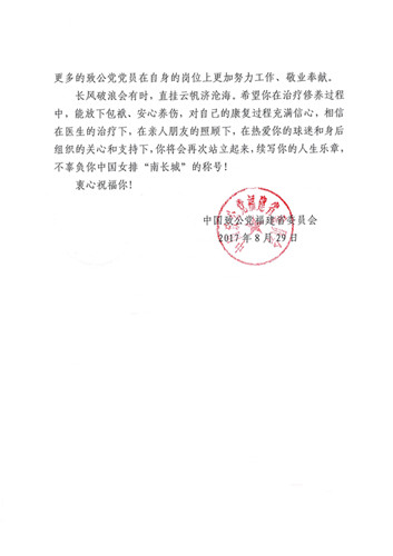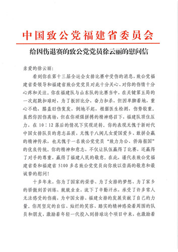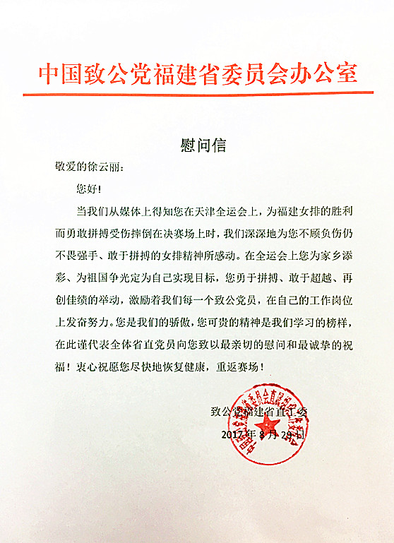 致公党福建省委、省直工委向她发去慰问信,鼓励她坚强战胜病痛早日痊愈,再次驰骋女排赛场。