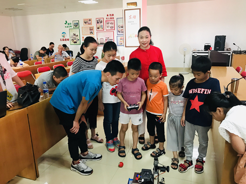 开幕式由中城虎岭社区书记邱鹏翔书记主持,主席台上就座的有中城虎岭社区书记邱鹏翔书记、致公党龙岩市委会秘书长刘翠琴,致公党信息学院支部主委李瑜芳。李瑜芳教授作了“机器人科普与机器人产业新进展”的科普讲座,介绍了机器人的发展历史、现状和用途。支部党员和信息学院学生手把手教社区孩子们操作移动机器人,让社区人员与移动机器人近距离接触,受到社区人员的一致好评。见图17-25。中城虎岭社区书记邱鹏翔书记表示,他们很需要科普讲座,希望致公党龙岩市委会经常派人来讲科普,龙岩中城街道虎岭社区当天下午就发了新闻报道。