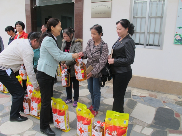 刘忠芳与失独家庭的成员亲切交谈,并送上花生油、大米等生活物资和慰问金,鼓励他们积极面对困难,注意身体健康,多参加有益的社会活动,重拾生活的信心与勇气。