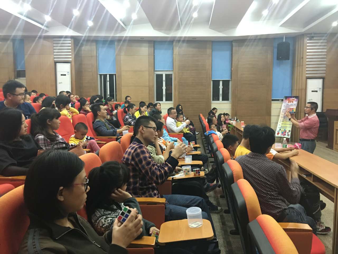 当晚,活动现场一片火爆,座无虚席。活动一开始,陈老师用了不到一分钟的时间还原魔方的精彩表演引起现场观众学员们的阵阵惊呼。观众学员中无论大人小孩,都专心致志地学习魔方。大小朋友们欢聚一堂,不分年纪,共享操控魔方的乐趣。
