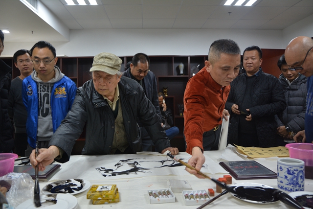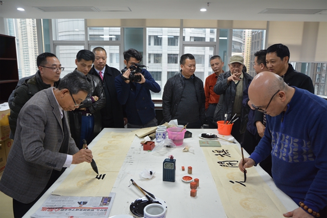 李秉记带领大家参观了省委会新办公楼。随后,现场挥毫焕彩、翰墨飘香,各位书画家即席创作,纷纷各展所长,创作出十余幅书画佳作,表现出了较高的艺术水准。笔会不但加强了书画家之间的文化艺术交流,也加深了两地党员之间的情谊。