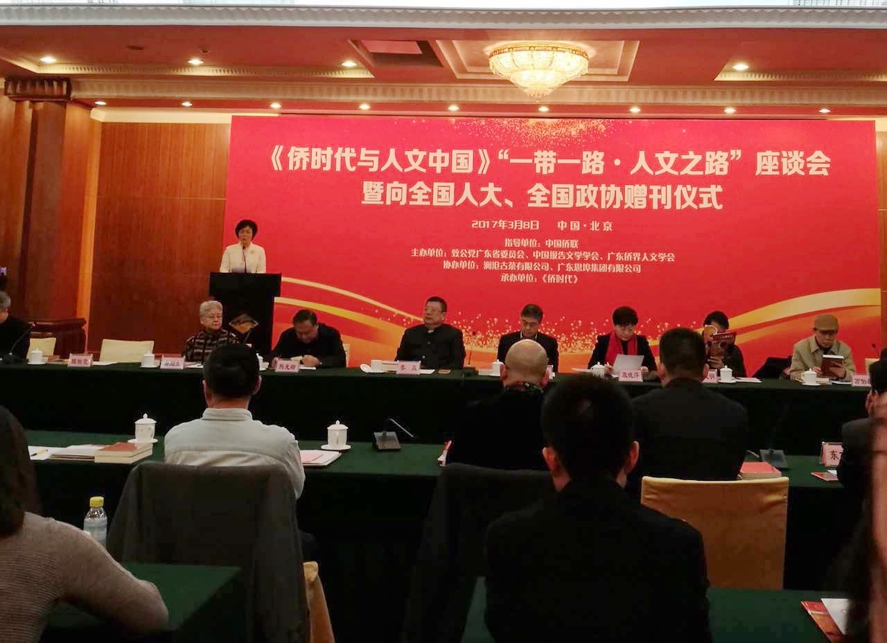 3月8日,由致公党广东省委会、广东侨界人文学会主办的《侨时代与人文中国》一带一路·人文之路”座谈会暨向全国人大、全国政协赠刊仪式在北京钓鱼台国宾馆举行。中国侨联副主席康晓萍,民革中央副主席何丕洁,致公党广东省委会副主委陈怡霓,中国侨联顾问唐闻生,广东侨界人文学会会长李崴,中山市政协主席丘树宏,致公党广东省委会文体委主任、广东侨界人文学会秘书长任海鹰等侨界、政界、学界人士共100余人出席了座谈会。