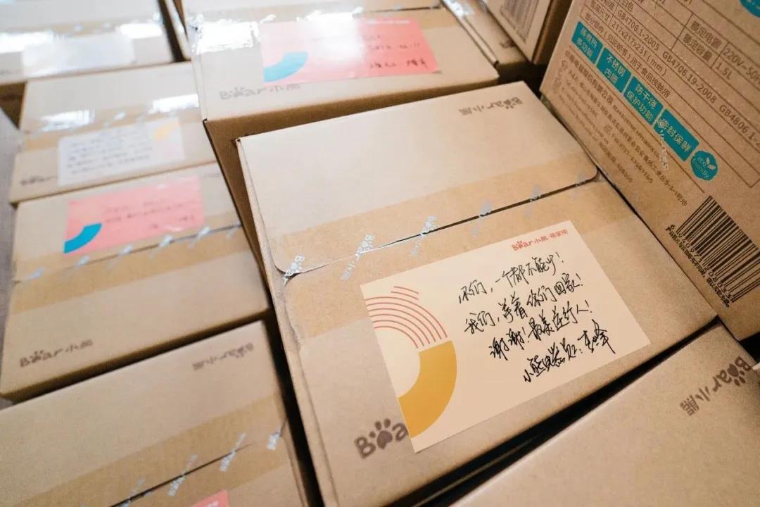 在物流主管的努力下,小熊电器克服了物资进鄂绿色通道拥挤和社会物流进鄂条件严苛的双重障碍,乘着以“务必资质合格、务必司机健康、务必最少中转、务必最快最安全抵达”为标准的物流快车,2月27日,追赠第二批物资,即5200个电热饭盒送至汉口医院、武汉中心医院、武汉大学人民医院东院、汉阳区人民医院、黄陂区人民医院及黄陂区中医医院。2月29日,第三批捐赠物资,即4800个电热饭盒送至武汉市北京大学人民医院和黄冈市黄州总医院,及武汉市人民医院和武汉市火神山医院所在街道。至此,两次捐赠共计10000台电热饭盒,全数送达一线的医护人员和街道网格工作人员手中。