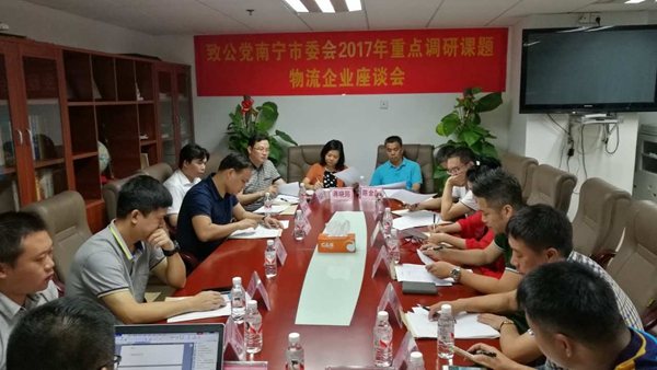 2017年,中共南宁市委邀请各民主党派、工商联、无党派人士联络组开展重点课题调研,致公党南宁市委承担了《关于借助“南宁渠道”提升我市现代物流业发展水平的建议》这一课题。为了充分了解南宁市物流企业发展总体情况,收集物流企业对南宁市物流运输结构、物流园区规划、服务效率、物流成本等方面的意见和建议,7月14日,致公党南宁市委会召开了物流企业座谈会,邀请公路物流、航空物流、农产品物流、冷链物流、物流园区运营管理等领域的14家企业代表就物流企业发展现状、如何发展多式联运等问题进行探讨。致公党广西区委会副主委、南宁市委会主委蒋晓筠参加了会议,区委会专职副主委陈金国莅会指导。