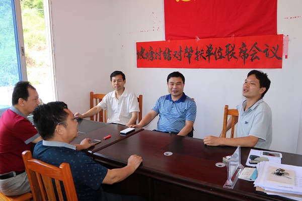黄继宗副主委(正面居中)与坡塘村委干部(右一)座谈研究扶贫措施
