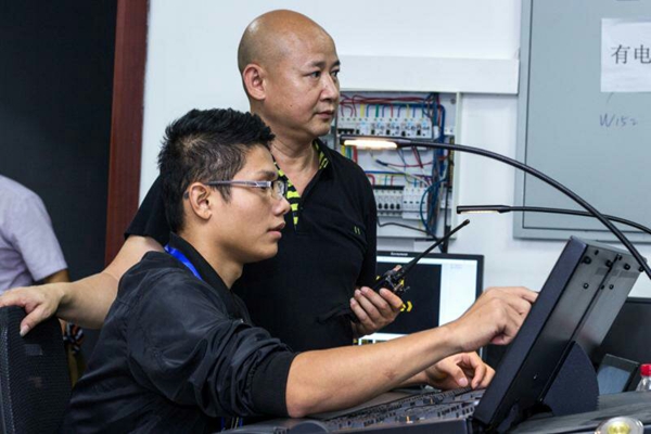 文化基层委田副主委指导灯光、音响。(廖真晓 摄)