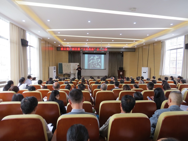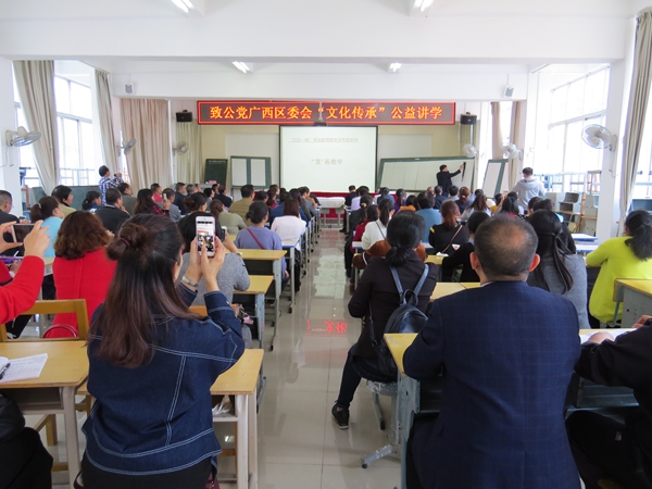 2017年10月23日、26日,致公党广西区委“文化传承——书法教育课堂教学”公益讲学分别在凤山县中学、南宁市红星小学举行。讲学由致公党广西区委研究室负责人、广西书法教育协会名誉会长盛敦荣先生主讲,他从文化传承和道德培养等多个视角,讲解了书法教育课堂教学的方式方法。当地约300名中小学老师前来聆听讲学。