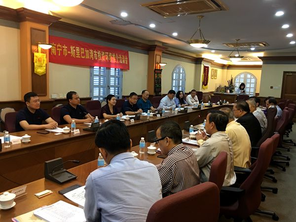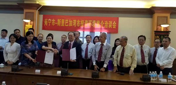 7月17日,蒋晓筠副主委在文莱斯市主持召开南宁市-斯里巴加湾市投资环境推介洽谈会。双方企业家就进一步开展合作项目交流了意见,对农副产品加工、旅游业、生物科技等企业入驻南宁投资兴业进行了深入洽谈。会上,蒋晓筠副主委和文莱斯市中华总商会林伯明会长分别代表中国致公党南宁市委员会与文莱斯里巴加湾市中华总商会共同签署了《合作关系备忘录》,旨在加强联系、互相支持、资源共享及携手并进,促进南宁市与斯里巴加湾市的经济社会发展。文莱斯市中华总商会代表、相关知名侨商代表应邀参加了洽谈会。