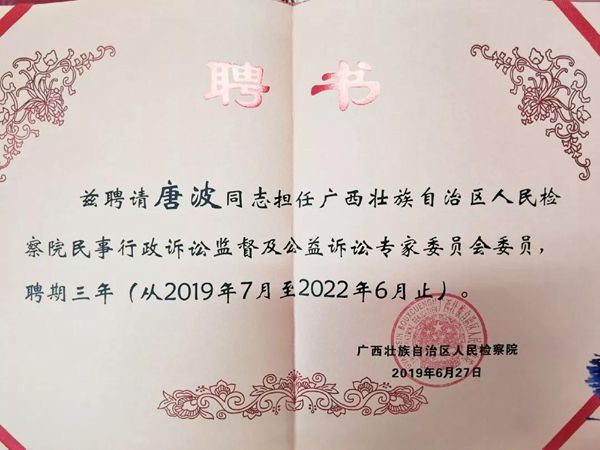 近日,致公党广西区委常委、区直属法律财经基层委员会主委、广西政协委员唐波同志,被广西壮族自治区检察院聘任为自治区人民检察院民事行政诉讼监督及公益诉讼专家委员会第一批专家。