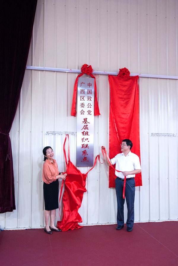 致公党广西区委会主委夏宁,中共南宁市委常委、统战部部长赵红明共同为“中国致公党广西区委会基层组织联系点”揭牌。(熊钢摄)