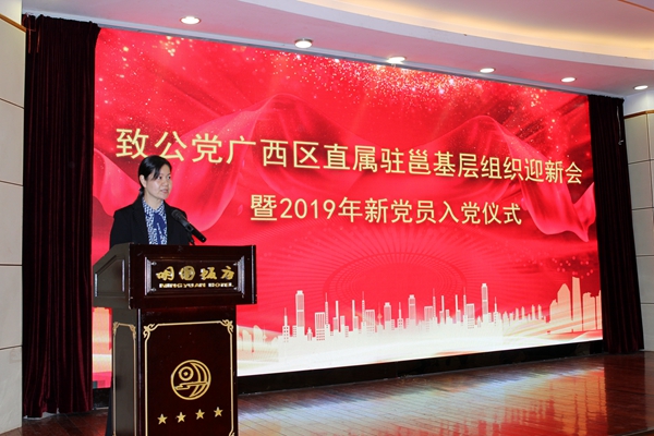 致公党广西区委组织部部长韩斯瑶主持迎新会并首先介绍了区直属驻邕各基层组织2019年发展的38名新党员的简要情况。随后,由陈金国、唐建忠、李华强等为参加新党员入党仪式的同志颁发了入党通知书和学习资料。在李华强的领誓下,30多名新党员一起进行了集体宣誓。