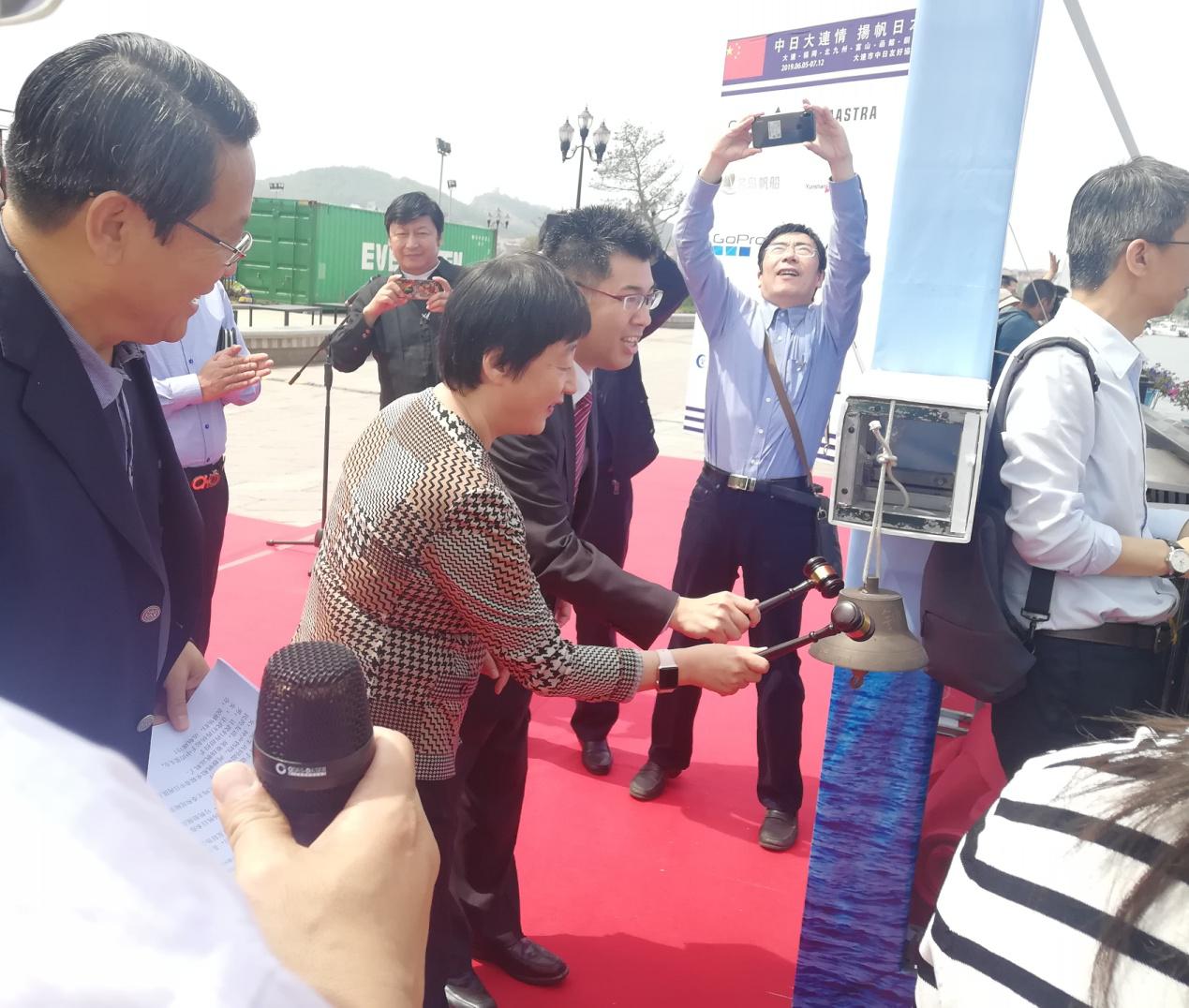 仪式最后,王大鸣、于建军和尾崎英一共同敲响启航钟,并乘船护航,祝福大连荣耀号远航启程一帆风顺,胜利凯旋。
