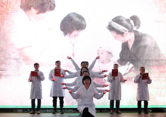 党员们在舞台前集体合影留念,用光影纪录时代的记忆,畅想全新的农历庚子年。