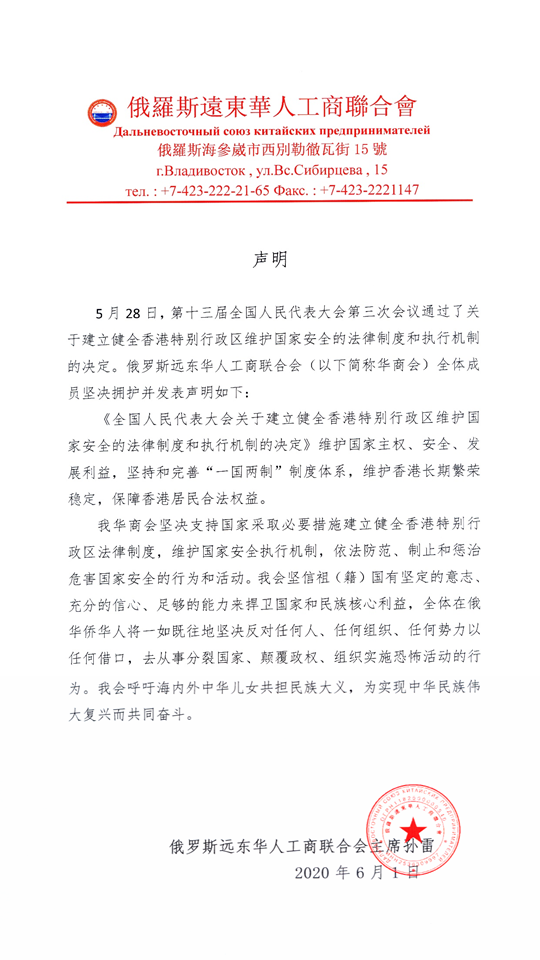 十三届全国人大三次会议5月28日审议通过《全国人民代表大会关于建立健全香港特别行政区维护国家安全的法律制度和执行机制的决定》,授权全国人大常委会制定香港特别行政区维护国家安全的相关法律。6月1日,致公党大连市西岗区基层委员会党员、俄罗斯远东华人工商联合会主席孙雷发表声明,坚决支持全国人大推动涉港国安立法,认为依法有效防范、制止和惩治危害国家安全的行为,将筑牢“一国两制”在香港实践的制度根基,为香港社会长治久安、市民生活祥和幸福提供坚实安全屏障。