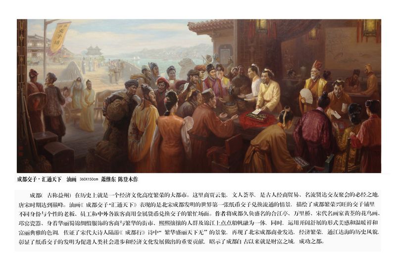 央视电影频道播出的百集电视纪录片《中国通史》,以音像的形式全面通俗地讲述中华的历史。在介绍到世界上首次取代传统金属货币流通的纸币——“交子”出现于我国北宋早期的四川成都时,荧屏上展示出画家萧继东、陈登木呕心沥血创作的大型历史油画《成都交子·汇通天下》。这幅画作第一次把人类历史上最早的纸币形象化了。