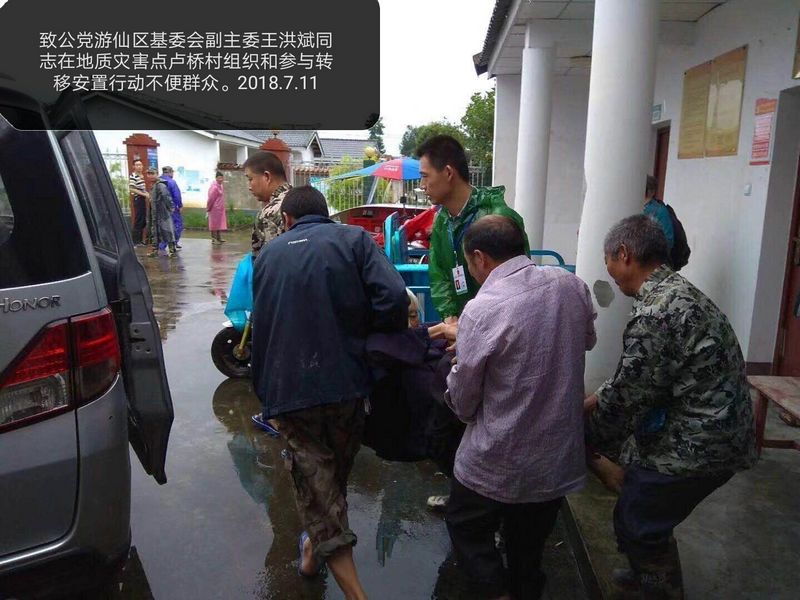 7月11日,致公党游仙区基层委员会副主委、太平镇副镇长王洪斌深入现场,连续奋战十多个小时,在太平镇芦桥村地质灾害点急需组织转移35户共61人。待农户全部被转移一个小时后,山体突然出现滑坡, 将10户31人的房屋全部冲毁。