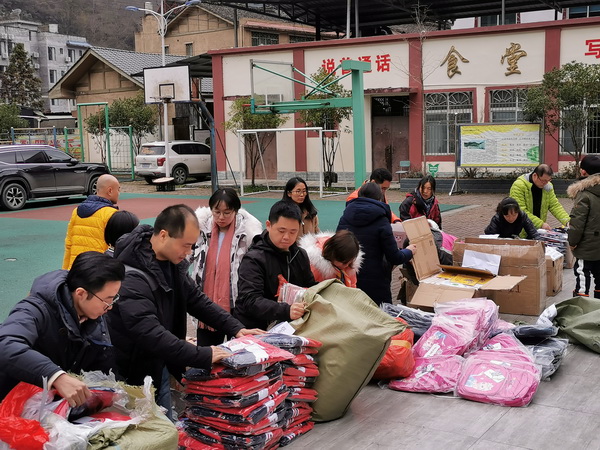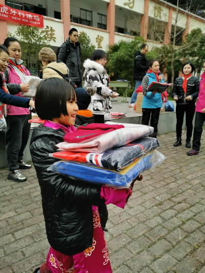 本次捐赠的物资包括订制的校服、爱心书包(含一系列文体用具)等63套,冬暖温情包(手套、羊绒围巾)77套,教职员工服装14套,图书绘本172套,以及部分文体用品,共计价值21337.4元。