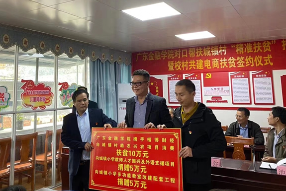 1月16日,由致公党四川省委会直属工委六支部副主委王舒率广东金融学院与楷博财经一行,至广东省梅州市城镇村开展“对口帮扶精准扶贫”活动,向城镇村助农兴农项目消费扶贫十万元、向城镇小学教师人才振兴及外语支援项目捐赠五万元,向城镇小学多功能教师改建配套工程捐赠五万元,并进行校村共建电商扶贫签约。