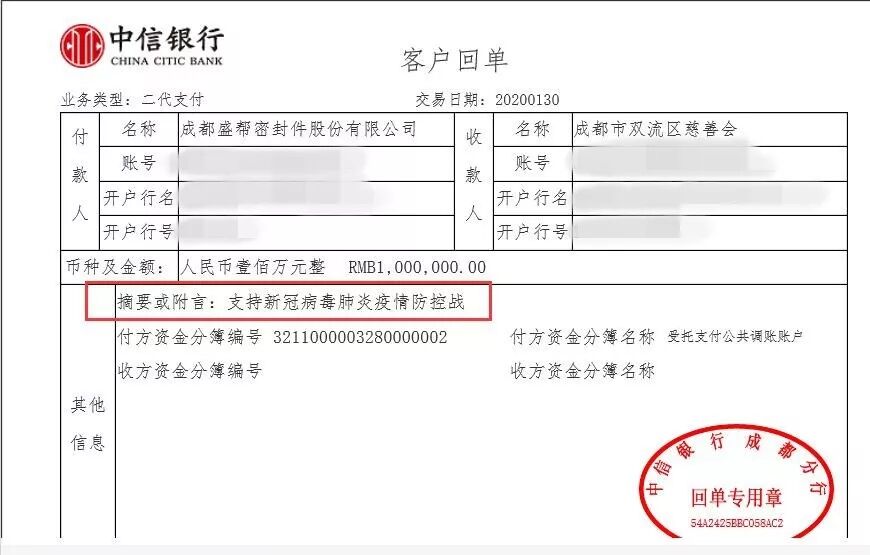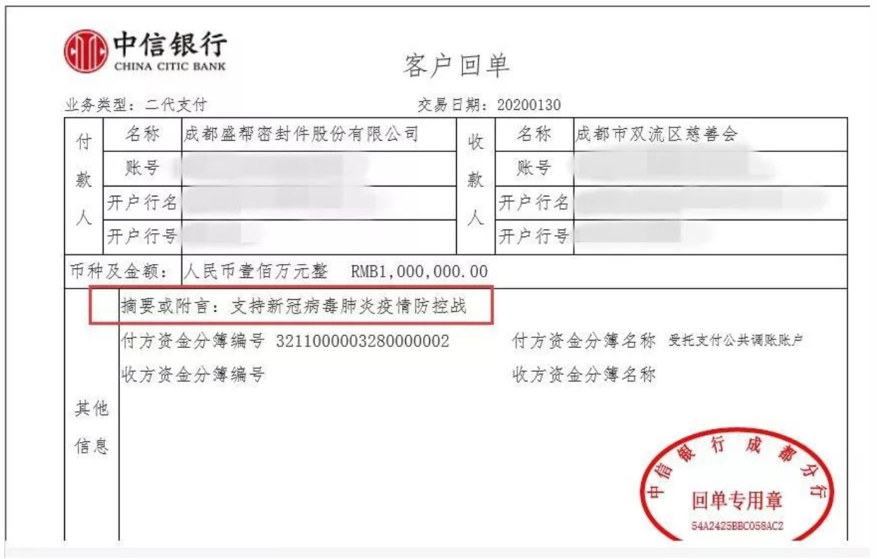 病毒无情,盛帮有爱。1月30日,市政协委员、致公党成都高新支部党员、成都盛帮密封件股份有限公司总经理赖凯,以他的企业名义向成都市双流区慈善会捐款100万元人民币,帮助抗击新型冠状病毒肺炎疫情,为打赢这场没有硝烟的战争尽一份心意。同时,为响应党中央、国务院关于此次疫情处置的决策和部署,积极配合省市区党委、政府的各项具体工作安排,盛帮股份于第一时间成立了疫情防控工作领导小组,并安排布置公司上下做好各项防控措施,为防疫工作做出一个企业应有的担当与贡献。