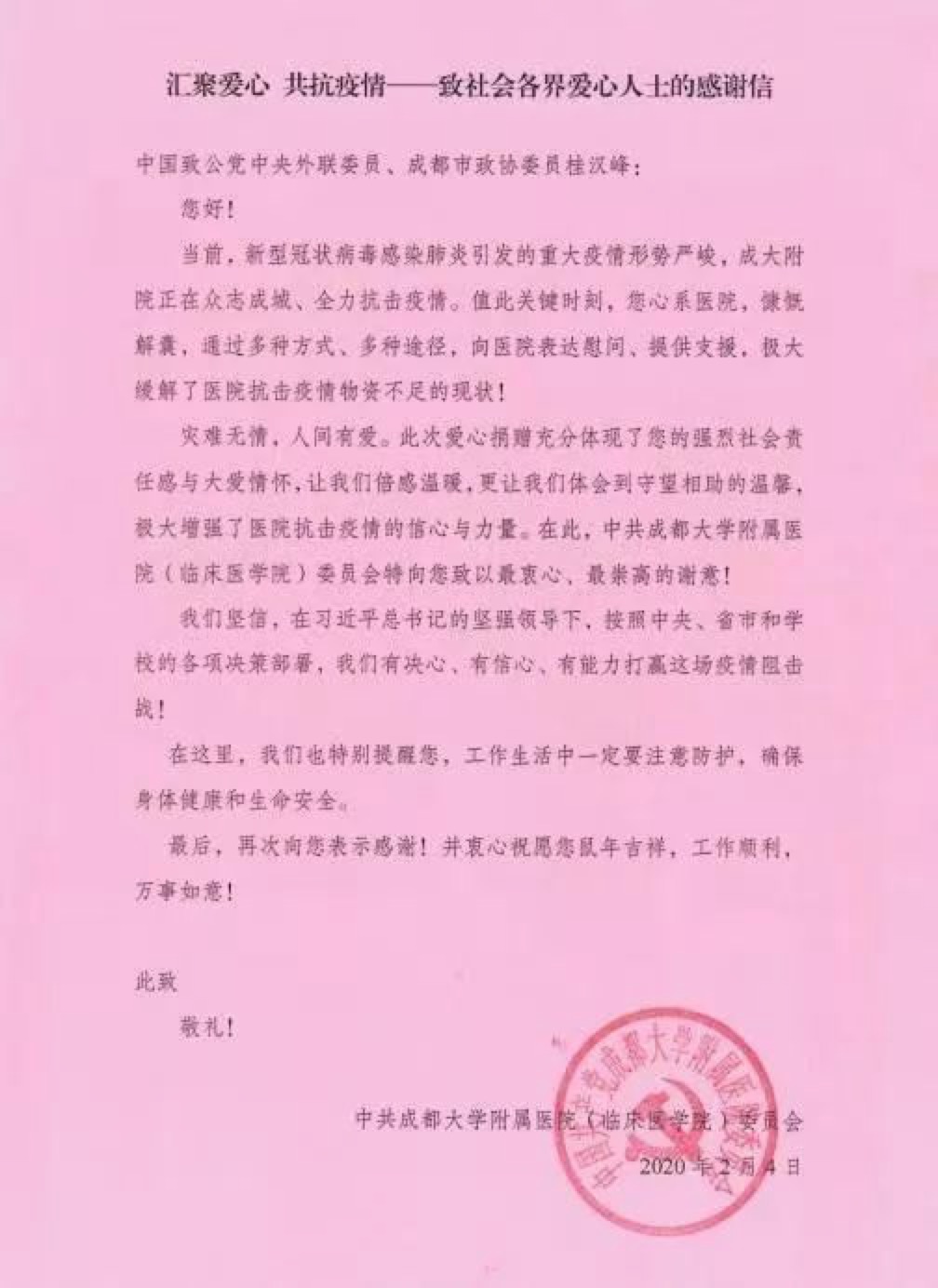 在抗击疫情的严峻时刻,市政协委员、致公党四川省委会对外联络委员会主任、致公党锦江区支部主委桂汉峰积极响应四川省委统战部和致公党省委会、市委会的号召和倡议,率先带头履职尽责,献计出力,积极主动参与疫情防控工作,并到一线捐赠急需物品,体现了一名致公党员在抗击疫情危急时刻的责任担当。