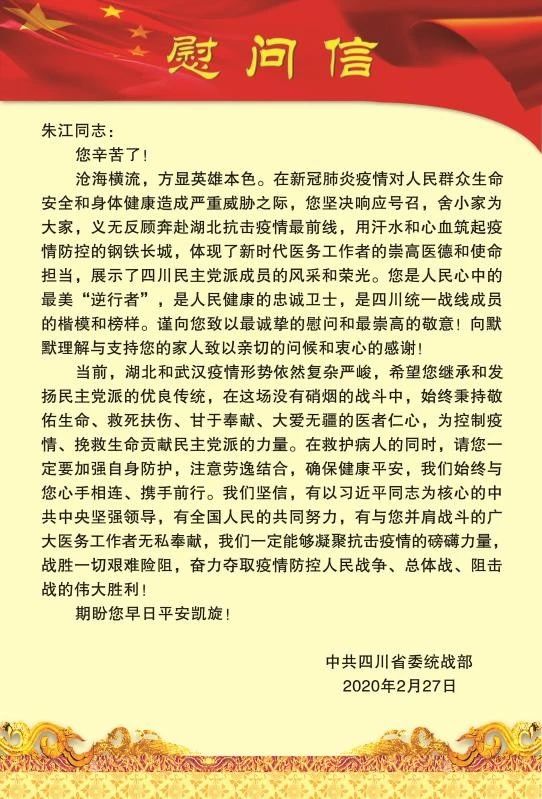自参与驰援武汉以来,致公党四川省委会领导对我和家人的工作生活表示了深切的关心关怀。副省长、省委会主委杨兴平多次委托省委会秘书长、支部主委杨志萍向我表示慰问,中共省委统战部也专门发来了慰问信,我对自己是一名致公党员感到由衷的自豪和骄傲。