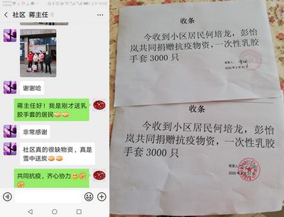 在全民抗击新冠肺炎疫情的特殊时期,许多热心市民、爱心团体和企业纷纷捐款捐物为一线人员筑起坚强后盾。2月21日上午,一对夫妻来到成都市锦江区沙河街道沙河社区居委会和四川蜀府物业公司望江水岸服务中心,以辖区居民和致公党员身份各自捐赠了乳胶手套3000只,共计6000只。他们用爱心和行动表达了“情系一线、以爱笃行”携手助力战胜疫情的信心与决心。社区和物业公司工作人员对他们雪中送炭的善举表示感谢,社区的居民也纷纷对此点赞。