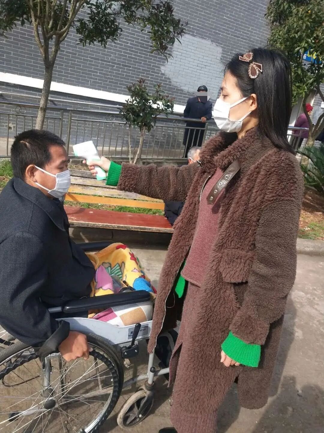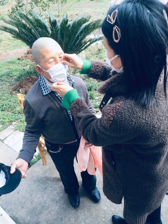 罗尹为老人整理口罩