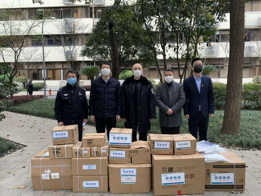 致公党四川省委会秘书长杨志萍(左二)等协调医用物资,给四川省人民医院送去消毒液800公斤,并看望部分在岗医护人员
