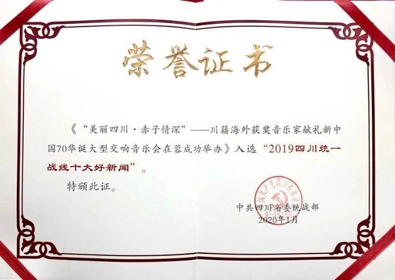 近日,在中共四川省委统战部举办的“2019四川统一战线十大好新闻”评选活动中,由致公党四川省委会推荐、省委会机关干部敬筠和王婕共同撰写的新闻作品《“美丽四川·赤子情深”——川籍海外获奖音乐家献礼新中国70华诞大型交响音乐会在蓉成功举办》被评为“2019四川统一战线十大好新闻”,成为四川省各民主党派中唯一一件获奖作品。