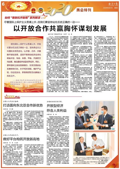 代表委员和专家学者在接受经济日报记者采访时表示,在全球新冠肺炎疫情蔓延,国际上保护主义思潮上升的背景下,习近平总书记明确提出,以开放、合作、共赢胸怀谋划发展,这宣示了我国进一步扩大对外开放的坚定决心,为我们应对异常复杂的国际环境指明了努力方向。