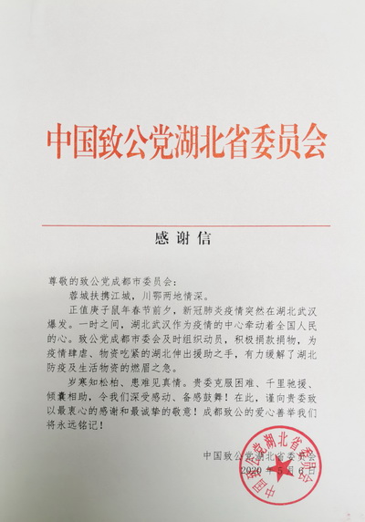 致公党成都市委会收到来自湖北的《感谢信》