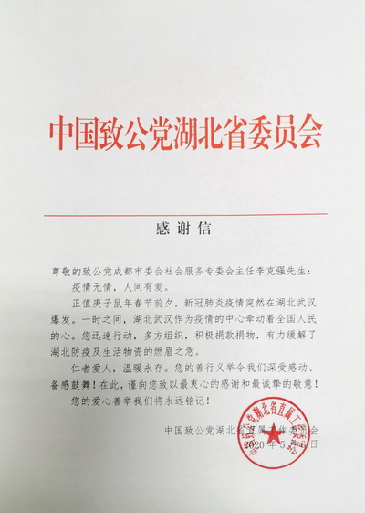 据悉,致公党成都市委社会发展与服务委员会主任李克强同志也同时收到了来自致公党湖北省委员会直属工作委员会的感谢信,感谢他在疫情期间组织动员力量向湖北伸出援助之手的善行义举。(市社服委供稿,图/文 致成宣)