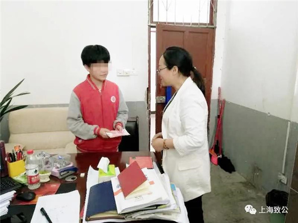 本次爱心助学活动捐助的两名学生中,一名是来自上海市奉贤区肖塘小学的小学生,因父母离异、家庭贫困,身体不好等原因,小朋友性格内向。致公党奉贤区总支部三支部党员、肖塘小学体育老师潘菊平一直关心他、照顾他、引导他,让他多交流,快乐学习,健康生活,此次向他送去了助学金1000元。
