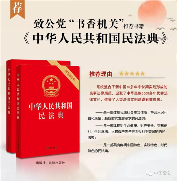 为进一步加强致公党机关队伍建设,提升机关工作效能,全面促进致公党各项工作,按照致公党中央主席办公会部署,决定在致公党中央和各省级组织、中央直属组织机关中开展“书香机关”读书活动。本读书活动第二期推荐书目为《中华人民共和国民法典》。2020年5月,十三届全国人大三次会议表决通过了《中华人民共和国民法典》,自2021年1月1日起施行。《中华人民共和国民法典》是新中国成立以来第一部以“法典”命名的法律,是新时代我国社会主义法治建设的重大成果。5月29日,中共中央政治局就“切实实施民法典”举行第二十次集体学习。中共中央总书记习近平在主持学习时强调,“民法典在中国特色社会主义法律体系中具有重要地位,是一部固根本、稳预期、利长远的基础性法律”。