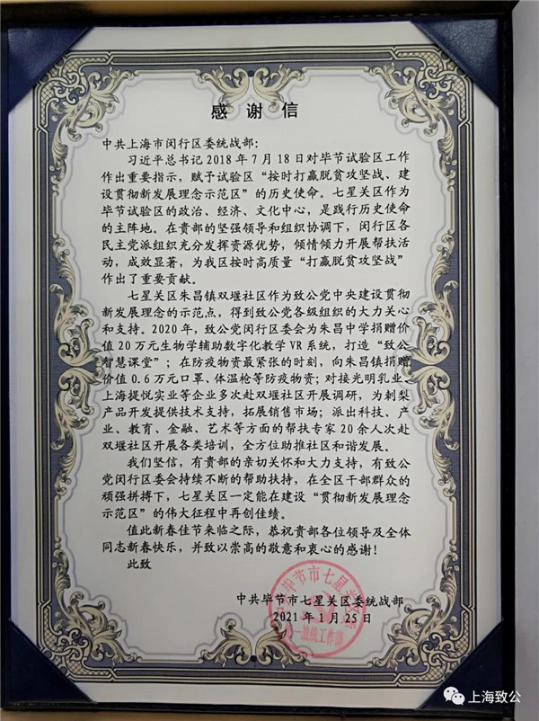 1月25日,中共毕节市七星关区委统战部向中共上海市闵行区委统战部发来感谢信,信中提到:“七星关区朱昌镇双堰社区作为致公党中央建设贯彻新发展理念的示范点,得到致公党各级组织的大力关心和支持。”特别提到2020年致公党闵行区委会为毕节市七星关区开展科技、产业、教育扶贫等全方位帮扶所做出的努力,字里行间透露着对闵行区委统战部、致公党闵行区委的感谢之情,凝聚着两地携手助攻坚的浓厚情谊。