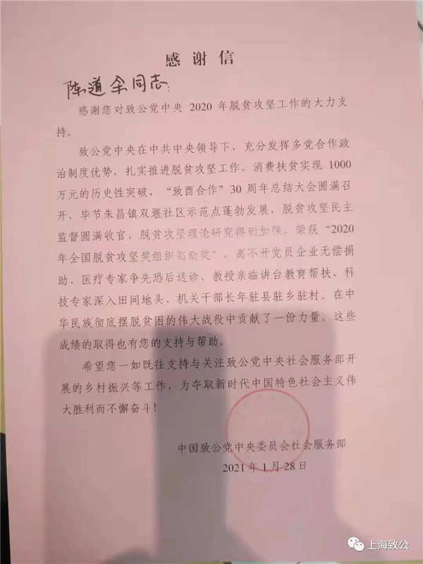 正是由于致公党闵行区委的绵绵用力、久久为功,1月28日,致公党中央委员会社会服务部向致公党闵行区委委员、区委社会服务专委会主任陈道于发来感谢信,充分肯定了致公党闵行区委在致酉合作、毕节朱昌镇双堰社区示范点发展方面所做的贡献。