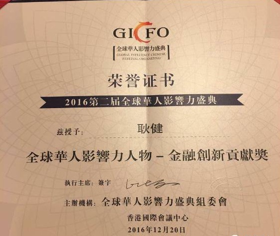 2016年12月20日,由香港卫视和全球杰出华人联合会等机构共同主办的“第二届全球华人影响力盛典暨香港一带一路投资峰会”在香港隆重举行。致公党陕西省委副主委、丰佳国际董事长、德同资本董事合伙人、西安交通大学客座教授耿健在本届峰会上荣获全球华人影响力人物—金融创新贡献奖。