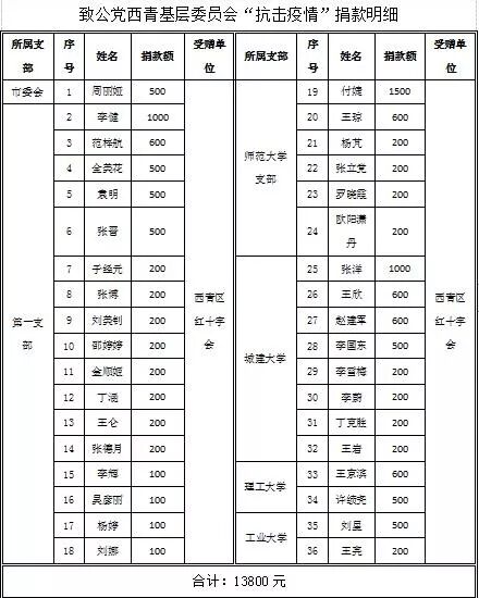 “一方有难,八方支援”面对来势汹涌的疫情,更多的党员选择用捐款的方式来支持本次抗“疫”斗争,通过发动全体西青党员进行慈善捐款,截至2020年2月7日,本次捐款共有36名党员参加,共筹得善款13800元。