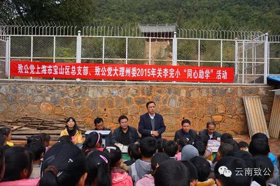 关李完小坐落于大理州宾川县鸡足山镇关李村委会,现有教师9人,学生68人,是鸡足山镇最偏远的一所山区小学。自2012年9月致公党上海市宝山区总支部、致公党大理州委联合开展“同心助学”活动以来,在致公党上海市宝山区的全力支持下,活动累计向关李完小捐赠组装电脑20台,校服、运动鞋87套,图书1135册,笔记本、练习本870本,铅笔、中性笔1852支,打印机1台,其他文体用品若干,捐赠总金额51753元。2014年11月,致公党大理州委还选派关李完小蔡文杰老师赴珠海参加广东省名教师工作室的学习培训,通过不同方式的帮扶促进学校的综合发展。