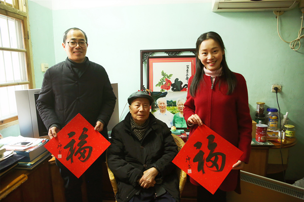 黎老1983年5月加入致公党,今年已经95岁高龄,身体依然健朗。听说党员们要去看望他,早早地在家中等候,并热情地将党员们迎进家中。党员付义坤将亲笔书写的“福”字送到黎老手中,并帮他一起张贴了新春对联。黎老十分感动,他说,很感谢市委会一直将老同志们记挂在心,将组织的温暖送到了老党员心坎上,自己虽然年事已高,仍会继续关注支持致公党事业的发展。(致公党杭州市委会)