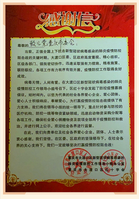 2月25日,潘为民秘书长代表致公党重庆市委会向大渡口区捐赠了总价值约10万元的抗疫物资,包括10000个医用外科口罩,300个N95口罩,200套防护服及30把额温枪。