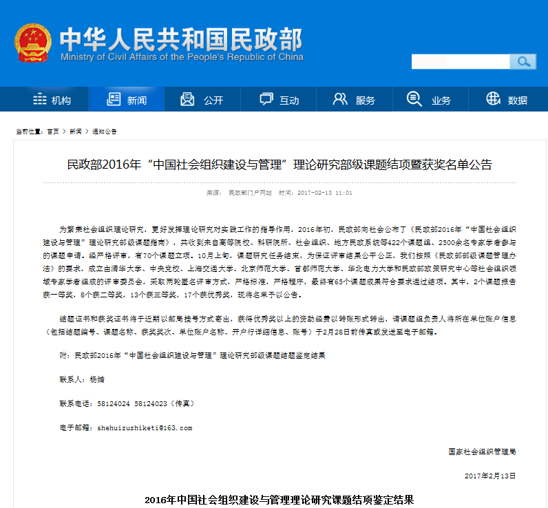 2016年10月上旬,课题研究任务结束,为保证评审结果公平公正,按照《民政部部级课题管理办法》的要求,民政部成立了由清华大学、中央党校、上海交通大学、北京师范大学、首都师范大学、华北电力大学和民政部政策研究中心等社会组织领域专家学者组成的评审委员会,采取两轮匿名评审方式,严格标准,严格程序,最终有65个课题成果符合要求通过结项。其中,2个课题报告获一等奖,8个获二等奖,13个获三等奖,17个获优秀奖。
