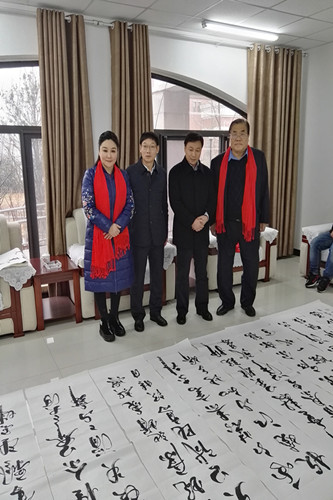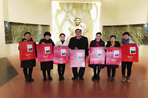 考察中田晓燕秘书长带来了他们设计的2017年《中国梦》新春挂历,祝国进院长为焦裕禄干部学院捐赠了八扇屏:毛主席诗词《沁园春.雪》、《中国梦》书法作品。焦裕禄干部学院副院长林祥军、副院长贺卫华接受了捐赠。