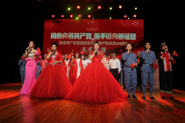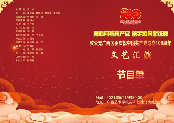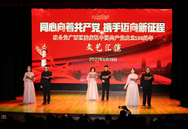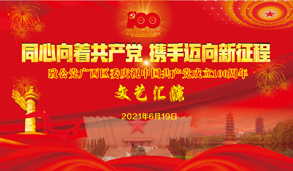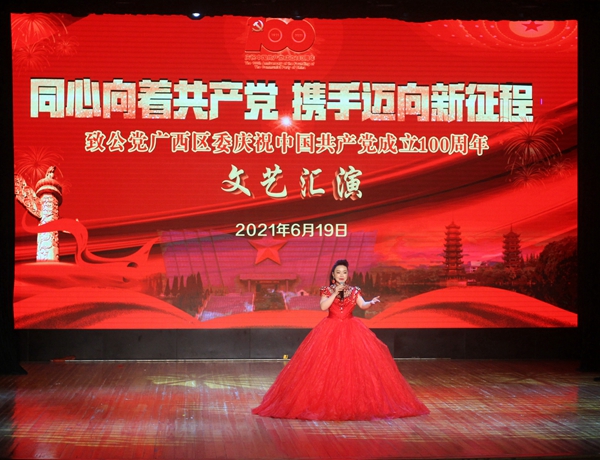 2021年6月19日晚,为庆祝中国共产党成立100周年,激励广大致公党员毫不动摇坚持中国共产党领导,不忘合作初心,继续携手前进,更好为实现中华民族伟大复兴凝心聚力,致公党广西区委会庆祝中国共产党成立100周年文艺汇演在南宁举行。致公党广西区委会主委夏宁,副主委欧余军和原副主委卢保江、陈金国,致公党广西区委会二级巡视员杨军和秘书长李永政出席观看演出。中共广西区委统战部部务委员林志华、民主党派工作处处长薛意和各民主党派广西区委会有关同志应邀出席观看演出。