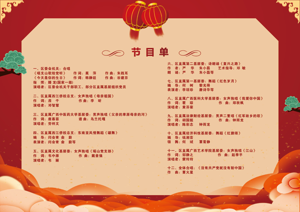 文艺汇演在《唱支山歌给党听》《今天是你的生日》的合唱中拉开序幕。《江山》《红旗颂》《红色岁月》《复兴之路》《今天是你的生日》《我爱你中国》……文艺汇演以歌曲、舞蹈、朗诵等为主要内容,围绕“同心向着共产党、携手迈向新征程”这一主题,从20多个致公党广西区直属基层组织报送的节目中精选出12个节目参加汇演。