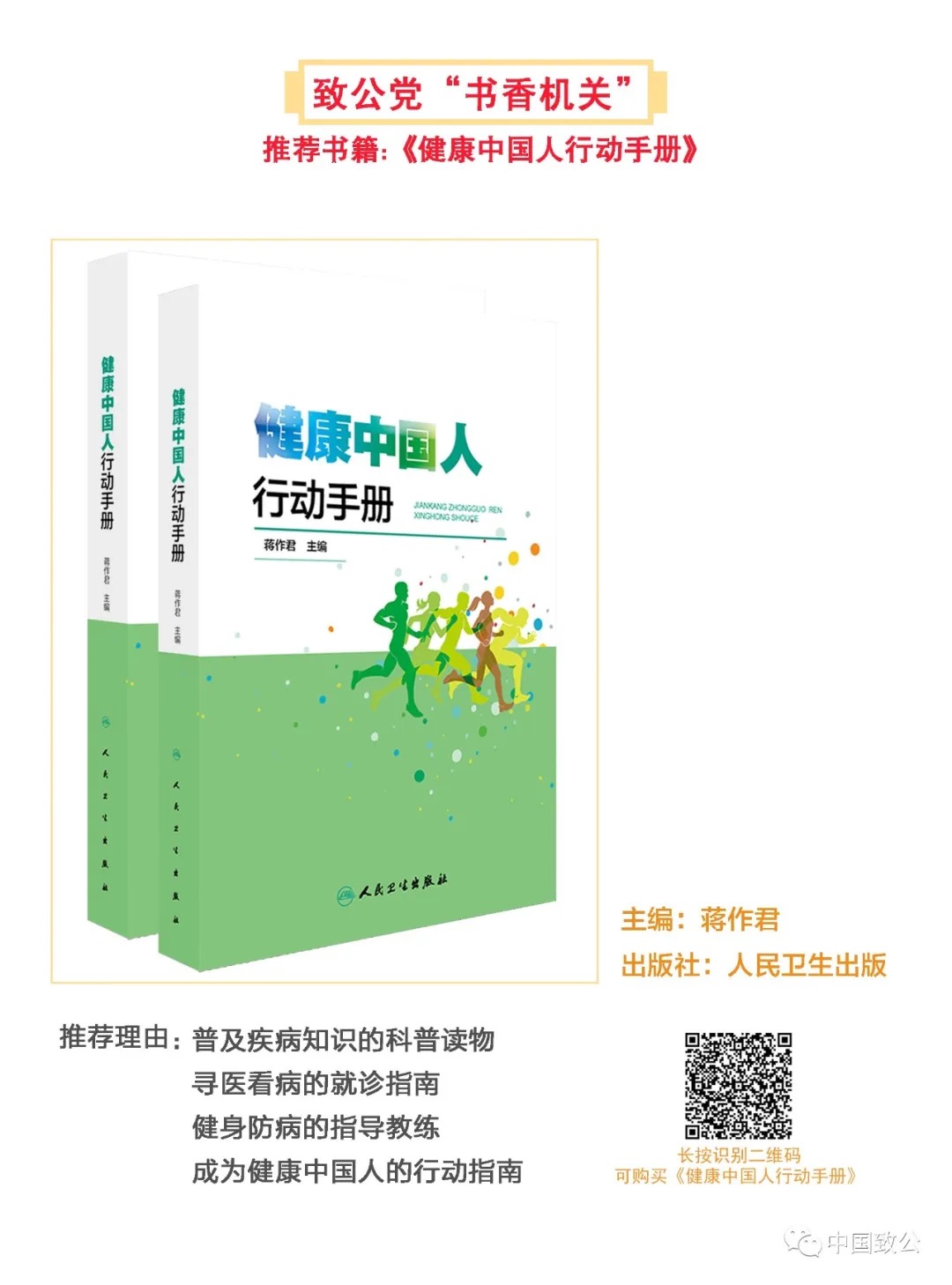 编者按: 为进一步加强致公党机关队伍建设,提升机关工作效能,全面促进致公党各项工作,按照致公党中央主席办公会部署,决定在致公党中央和各省级组织、中央直属组织机关中开展“书香机关”读书活动。本读书活动第一期推荐书目为《健康中国人行动手册》,该书是由全国政协常委、副秘书长,致公党中央常务副主席蒋作君任主编,致公党中央医药卫生委员会和中国社区卫生协会组织部分专家参与编写完成的。该书汇集了百余条涉及城乡居民基本医疗卫生和健康保健知识,希望这本书能作为普及疾病知识的科普读物、寻医看病的就诊指南、健身防病的指导教练,使大家从中受益,成为健康中国人。