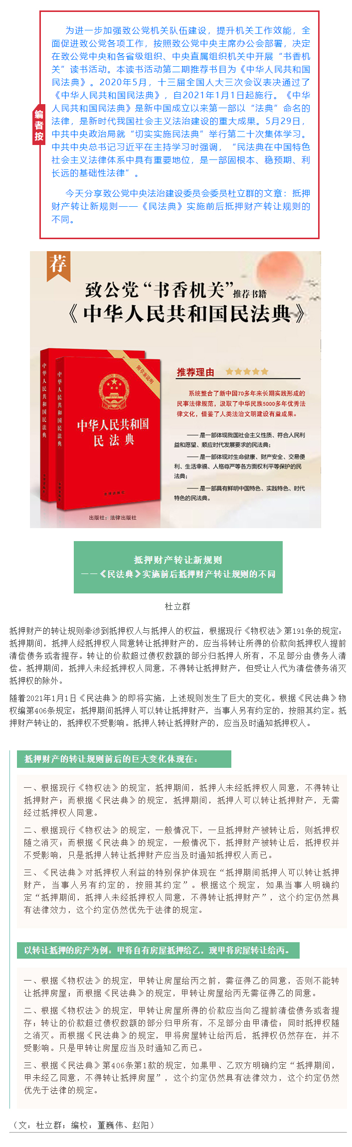 书香机关|杜立群:抵押财产转让新规则——《民法典》实施前后抵押财产转让规则的不同