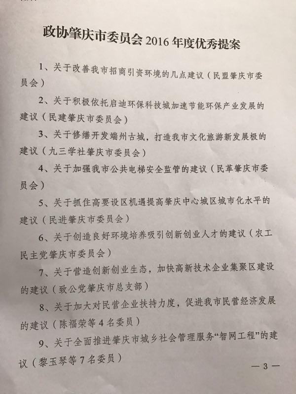 1月6日至9日,肇庆市政协十一届一次会议在端州城区召开。致公党肇庆市总支部提出的《关于营造创新创业生态,加快高新技术企业集聚区建设的建议》的集体提案被评为肇庆市政协2016年度优秀提案。该提案执笔人为总支部委员会党员赵淑媛。