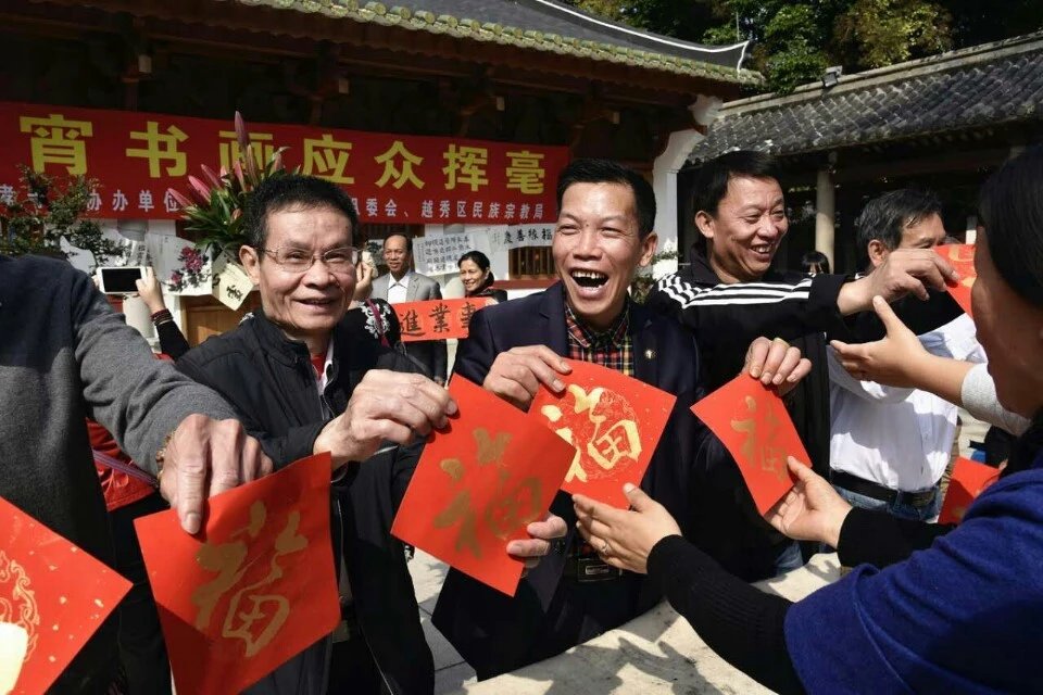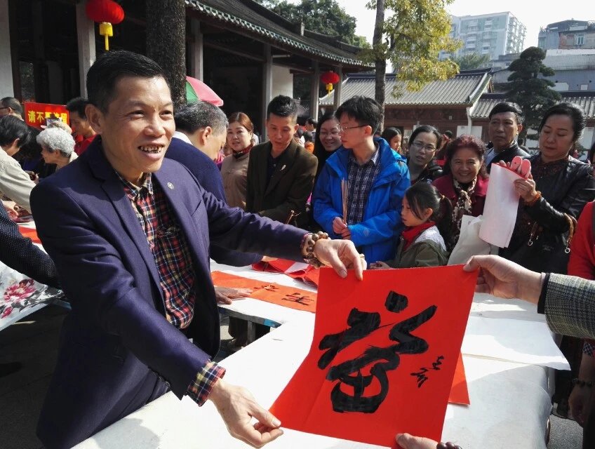 中国文化艺术研究中心主席、广州越海书画院院长陈志雄,中国文化艺术研究中心常务副主席黎艺豪及副主席兼秘书长苏宝源,广州越海书画院副院长廖伟彪、贺惟宜莅临现场,与20多位广东书画名家为市民写福送“福”,挥毫作书画。广州光孝寺天王殿前取“福”的市民热情高涨,书画家们在3个小时中市民写福送福共1000多幅。