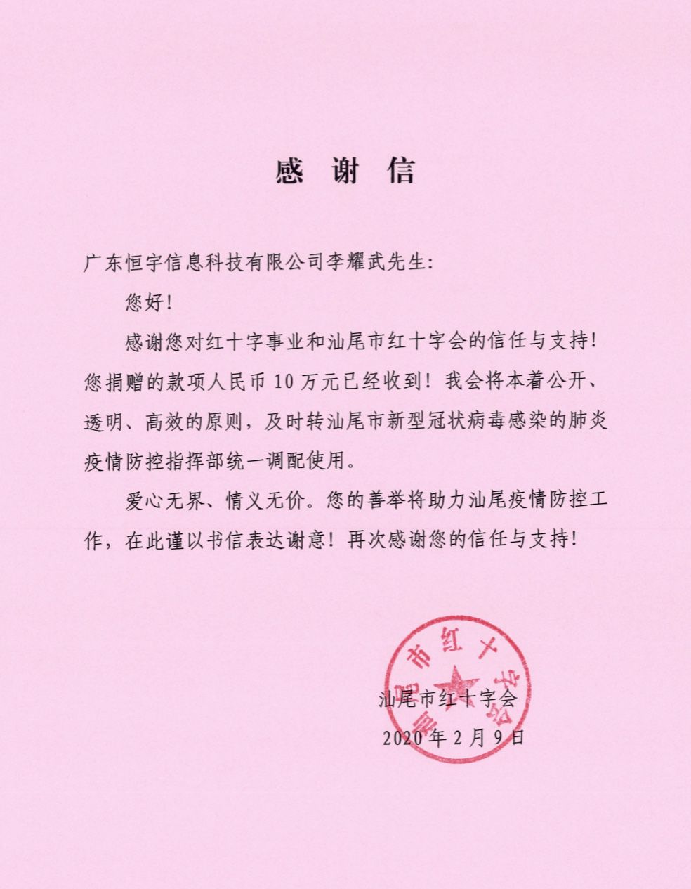 汕尾红会的感谢信